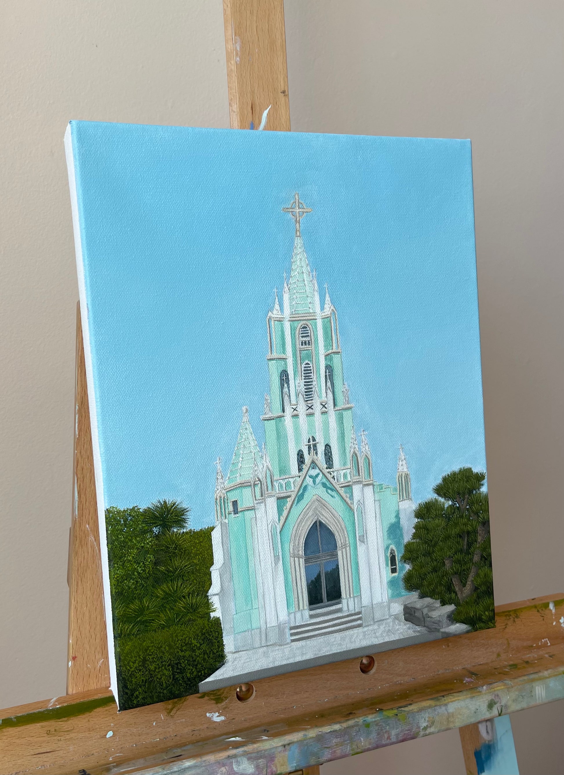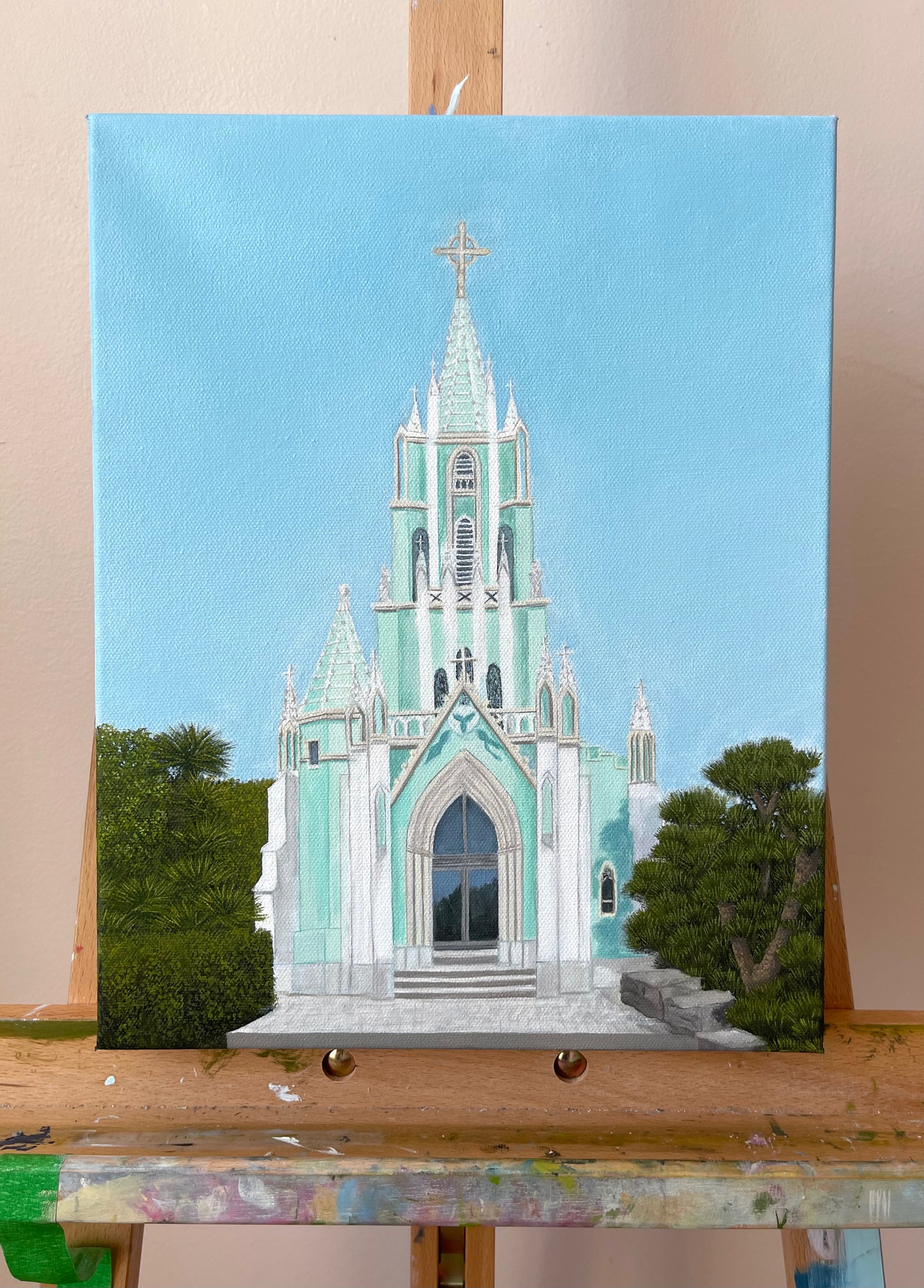 Located in Nagasaki, Japan, is St. Francis Xavier Memorial Church, a stunning neo-Gothic landmark. Originally built in 1913 as the Hirado Catholic Church, it was later relocated in 1931 to its current hilltop position, offering breathtaking views of Hirado’s harbor and town. Its tall steeple and elevated location make it one of the most recognizable structures in the area, standing above a nearby Buddhist temple, pointing people's eyes toward the cross.